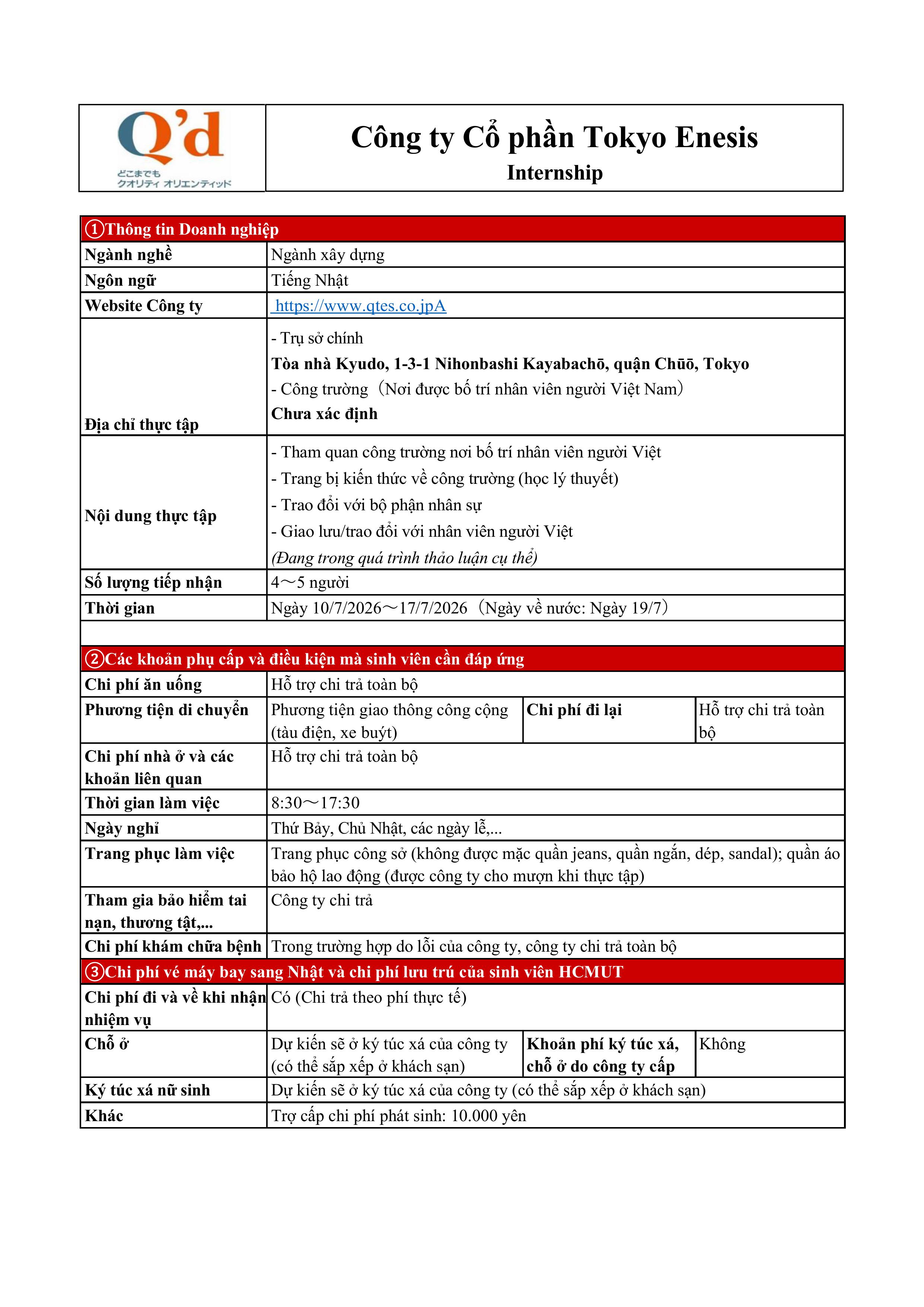 Chương trình Thực tập Quốc tế tại Nhật Bản do Công ty Cổ phần Tokyo Enesis tài trợ chính là cơ hội dành cho bạn!