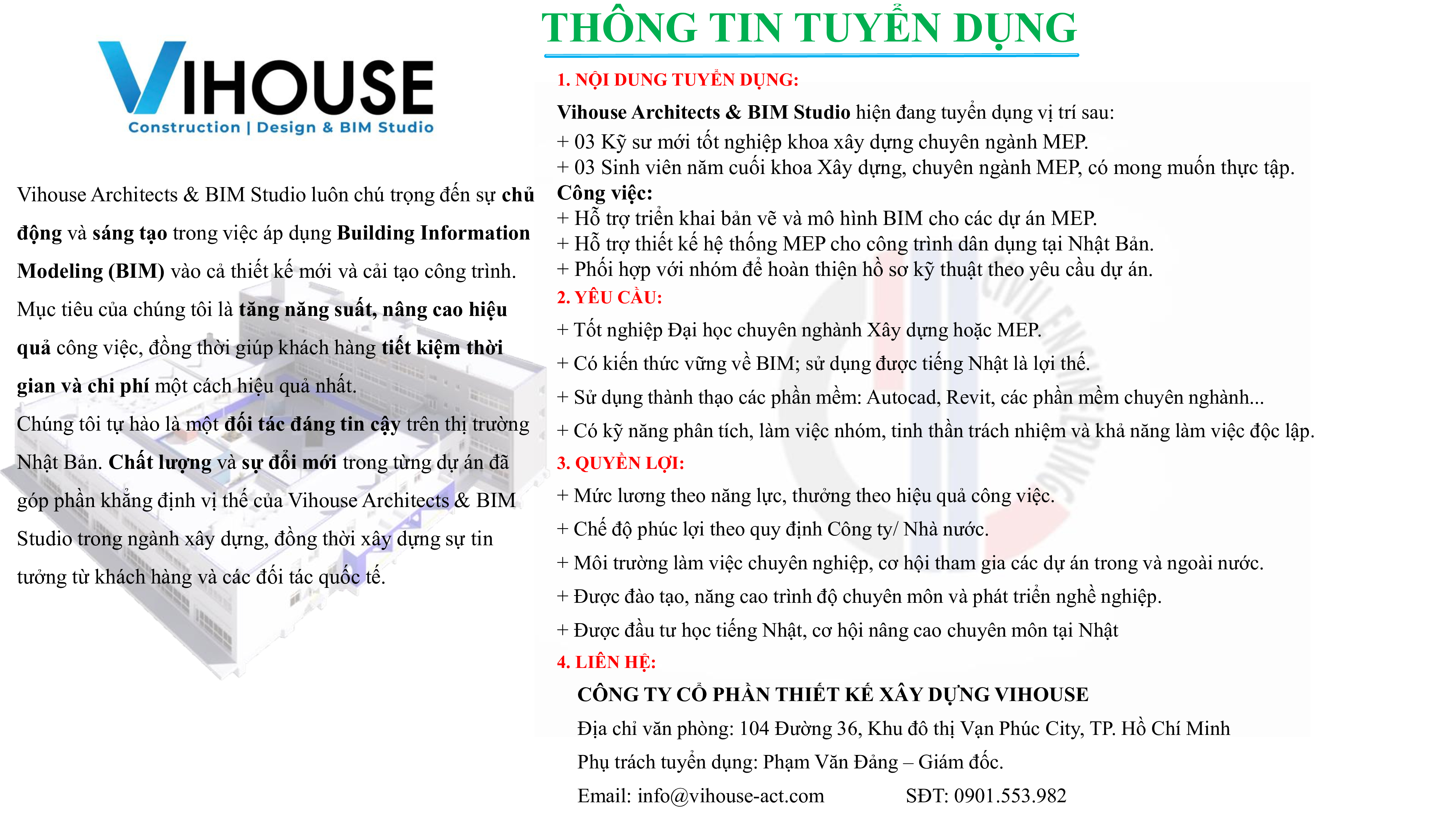 Vihouse Architects & BIM Studio hiện đang tuyển dụng các vị trí sau: