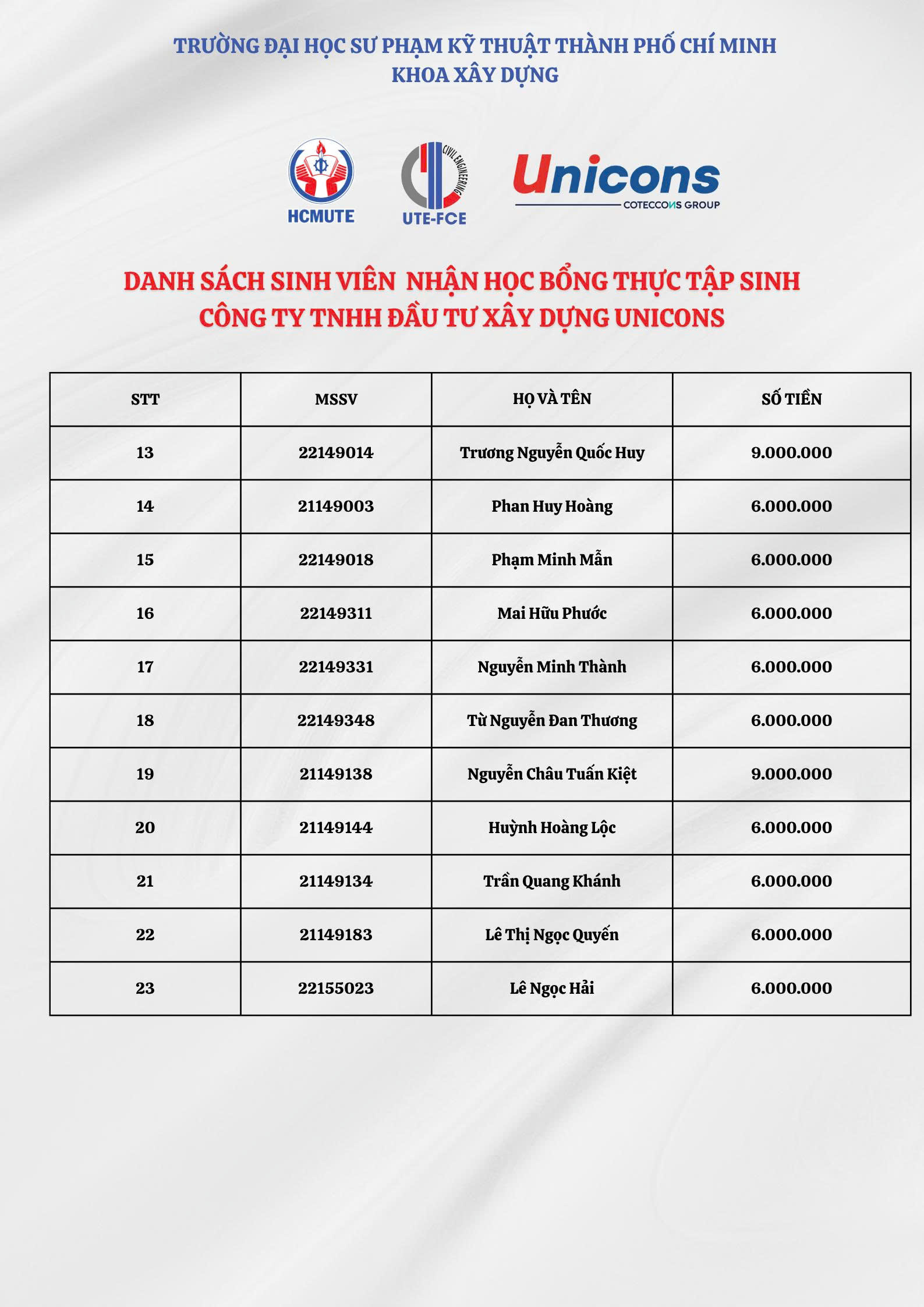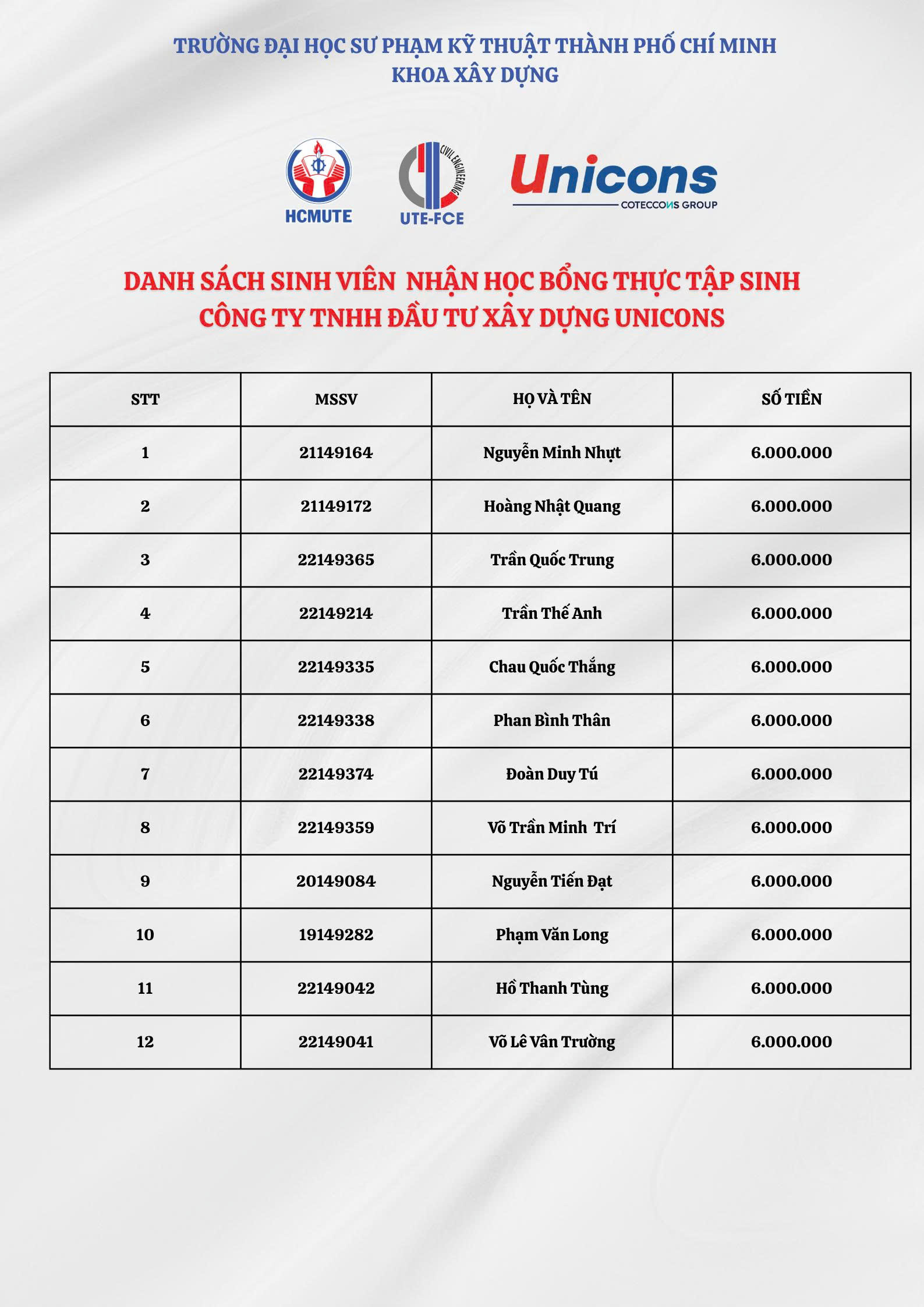 Khoa Xây dựng xin chúc mừng các bạn sinh viên có têntrong danh sách đã nhận được học bổng chương trình thực tập sinh của Công ty TNHH Đầu tư Xây dựng Unicons.Các bạn đã được tiếp cận được môi trường làm việc chuyên nghiệp, năng động, tích lũy kinh nghiệm thực tế và phát triển bản thân trên con đường trở thành kỹ sư tương lai.