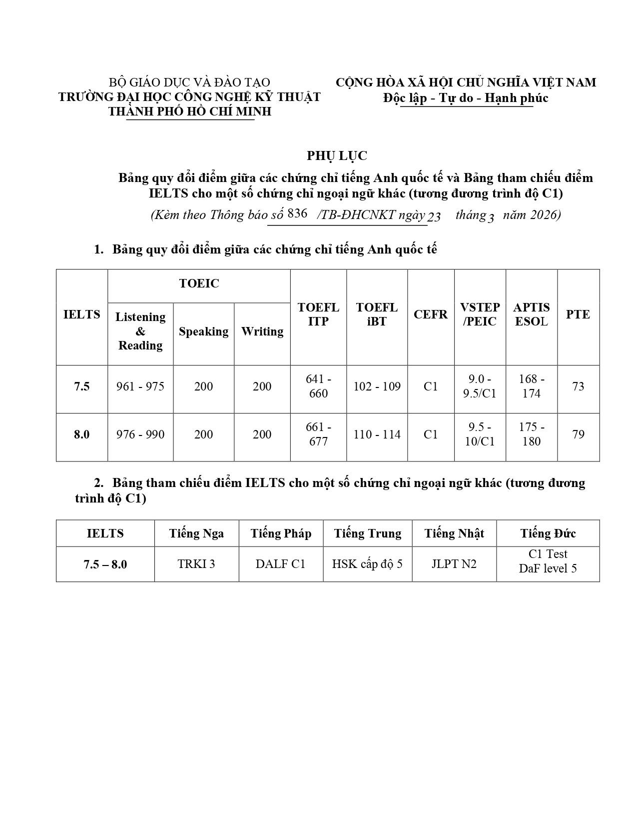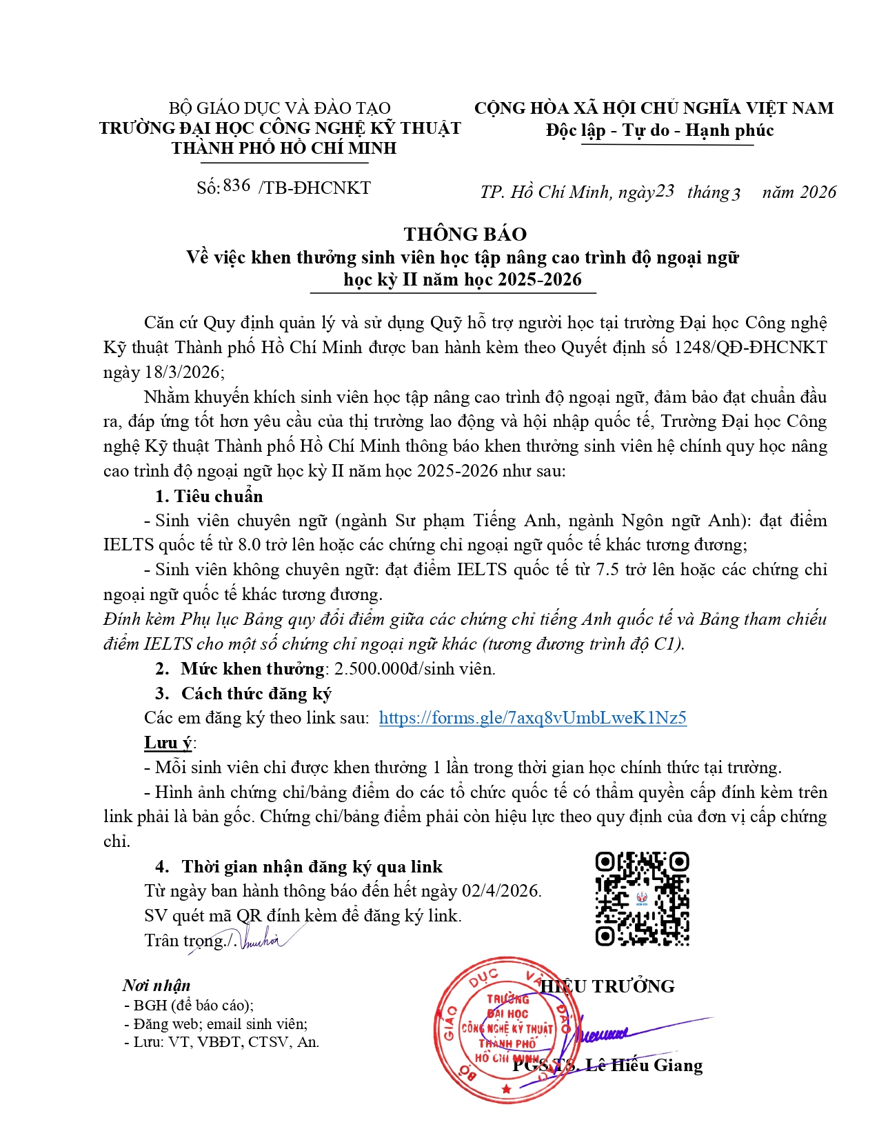 -Nhằm khuyến khích sinh viên nâng cao trình độ ngoại ngữ, Trường triển khai chương trình khen thưởng sinh viên đạt chứng chỉ ngoại ngữ quốc tế trong HKII năm học 2025–2026.