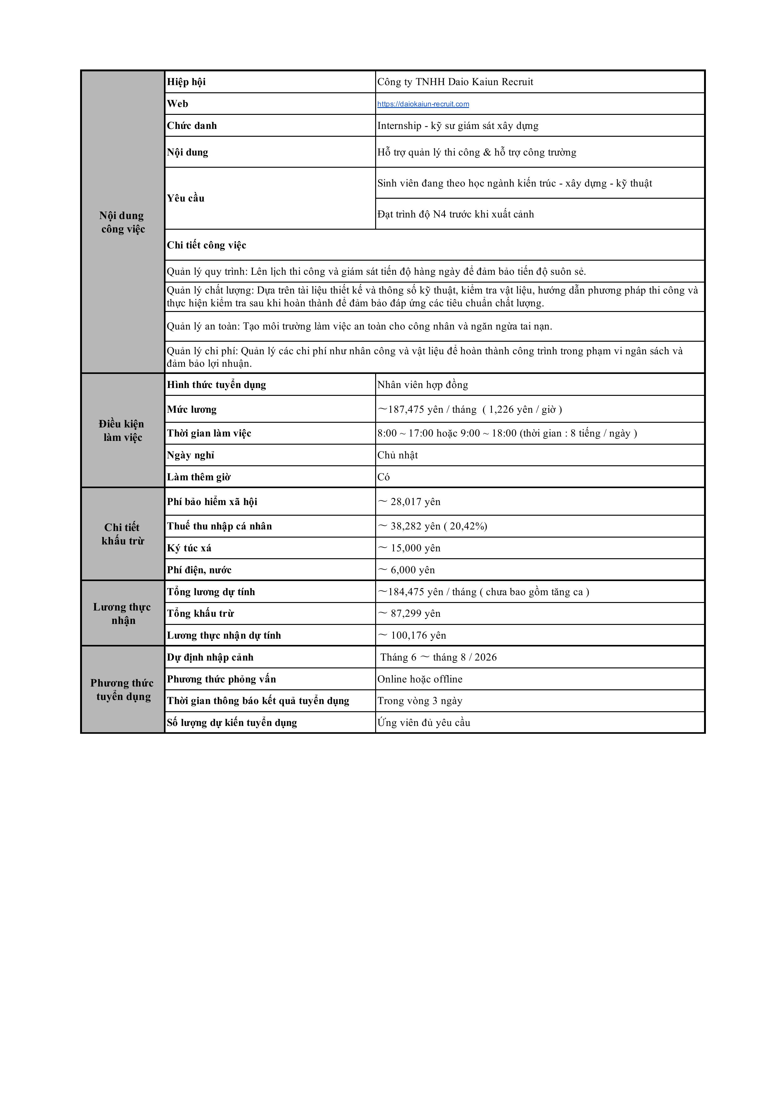 Lương thực nhận dự kiến: ~ 100,176 yên/tháng (chưa tính tăng ca)