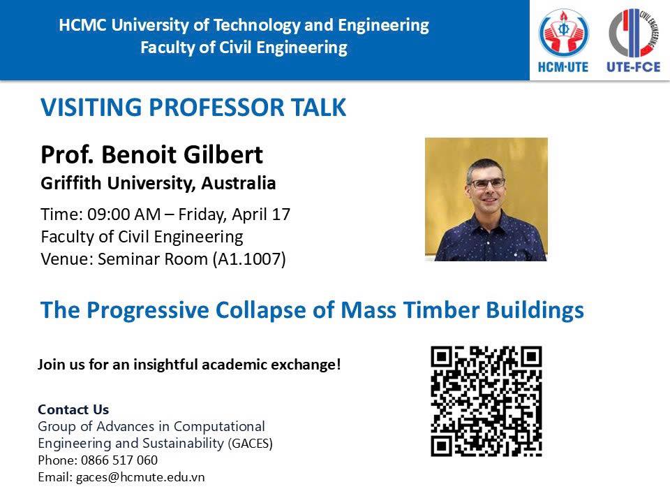 Khoa Xây dựng, Trường Đại học Công nghệ Kỹ thuật TP.HCM trân trọng kính mời Quý Thầy/Cô và các Anh/Chị tham dự buổi trao đổi học thuật với Giáo sư Benoit Gilbert, Đại học Griffith, Úc.