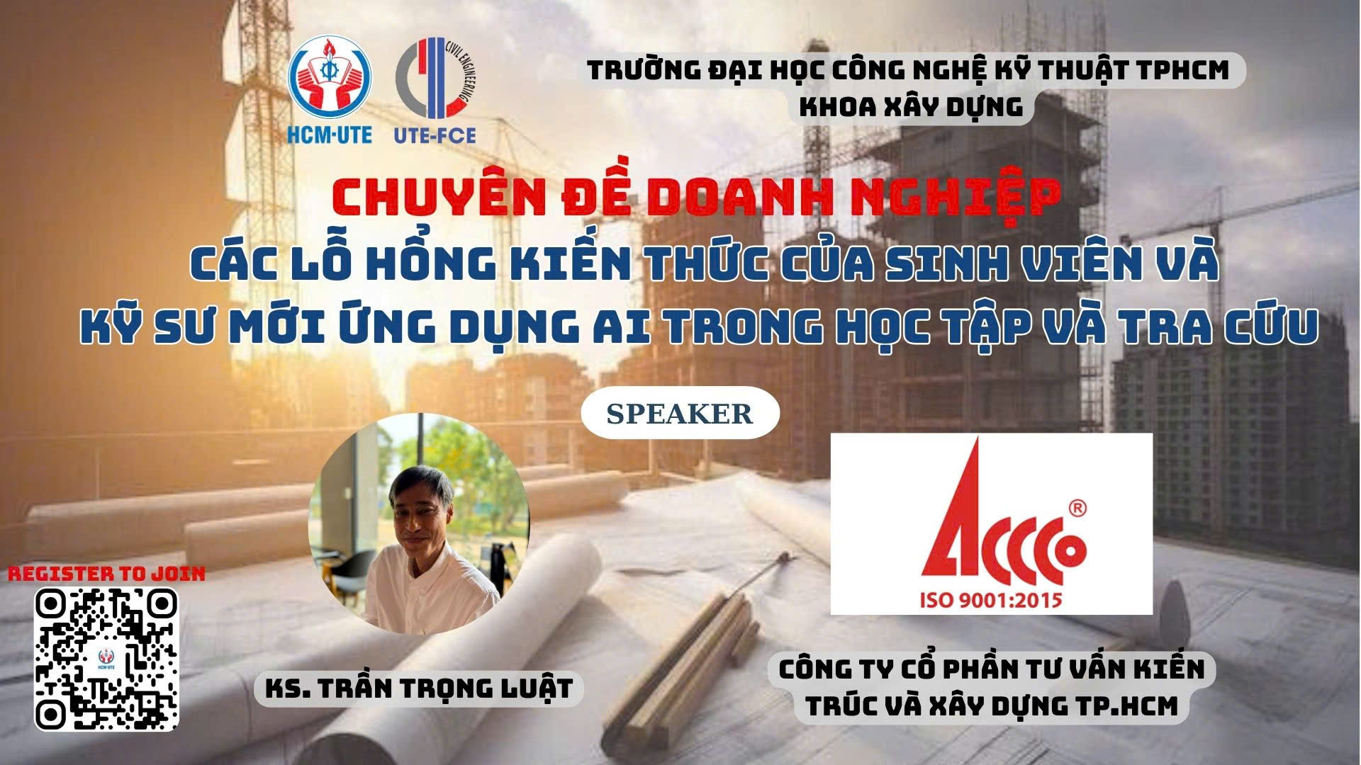 - Vào sáng ngày 10/4/2026, tại Trường Đại học Công nghệ Kỹ thuật Thành phố Hồ Chí Minh, buổi chuyên đề về "Các lỗ hổng kiến thức của sinh viên & kỹ sư mới - Ứng dụng AI trong học tập và tra cứu" đã diễn ra vô cùng thành công tốt đẹp. Buổi chia sẻ có sự góp mặt của KS. Trần Trọng Luật đến từ Công ty Cổ phần Tư vấn Kiến trúc và Xây dựng TP.HCM (ACCCo) – đơn vị có nhiều kinh nghiệm trong lĩnh vực tư vấn và thiết kế công trình.